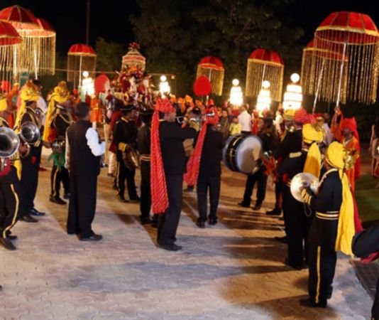 Traditional wedding band with live instruments that adds royal charm and festive vibes to wedding processions and ceremonies.
